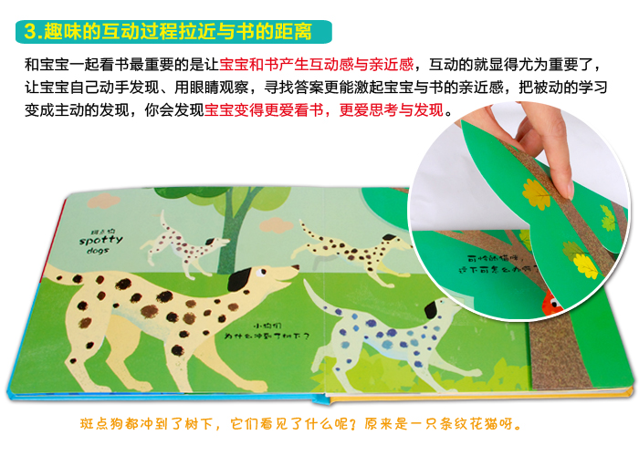 3.趣味的互动过程拉近与书的距离。和宝宝一起看书*重要的是让宝宝和书产生互动感与亲近感,互动的就显得尤为重要了,让宝宝自己动手发现、用眼睛观察,寻找答案更能激起宝宝与书的亲近感,不用说教,把被动的学习变成主动的发现,你会发现宝宝变得更爱看书,更爱思考与发现。