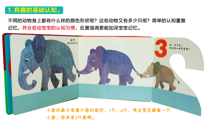 1.有趣的基础认知。不同的动物身上都有什么样的颜色形状呢?这些动物又有多少只呢?简单的认知重复记忆,符合低幼宝宝的认知习惯,反复强调更能加深宝宝记忆。