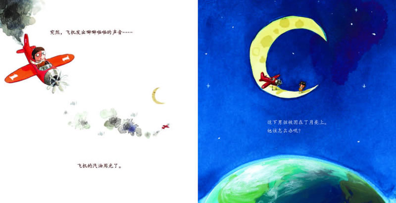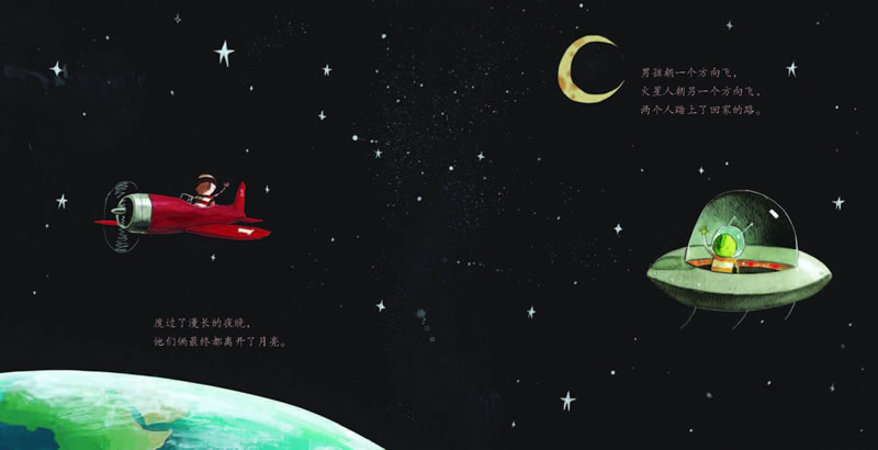 男孩在壁橱里发现了一架飞机,于是他决定驾驶飞机去兜兜风。可是,飞机的燃料用尽,只好迫降月球。月球上还有一个迷路的孩子——小火星人,他们在黑暗中尖叫着相遇了。在漆黑的月球上,两人携手解决对方的难题,帮对方找到回家的路。虽然他们飞向各自的星球,不过却收获了新的朋友。
