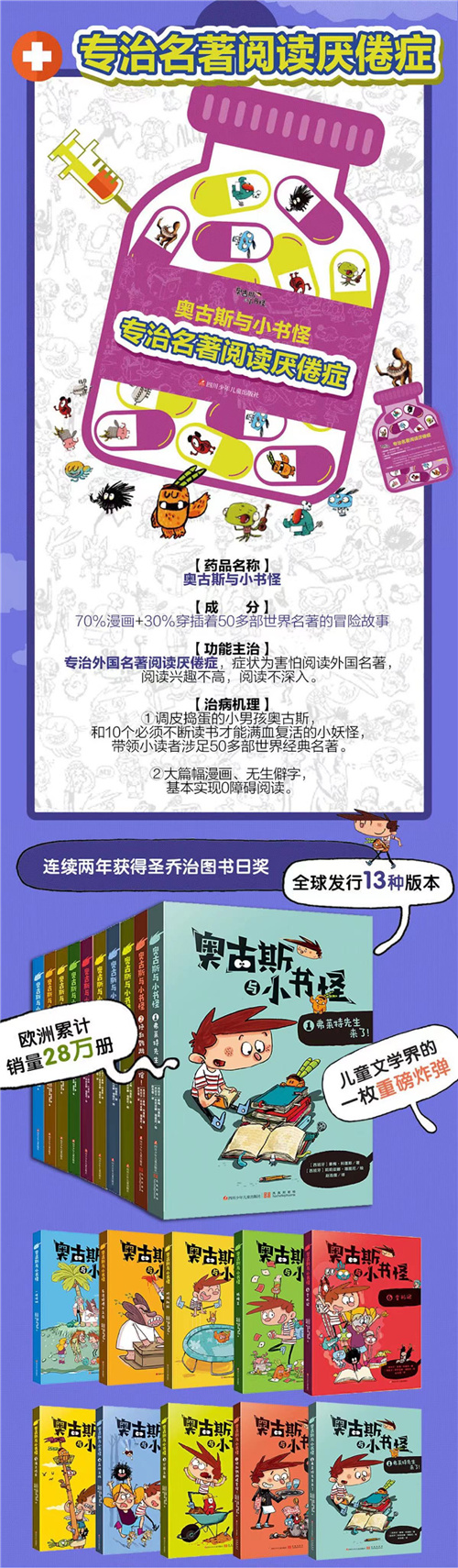 一个叫奥古斯的小男孩,是一名小学生,他-- 1.丢三落四;2.发愁写作文;3.不爱收拾房间;4.有个死对头莉迪亚! 但这一切在奥古斯认识了一群小书怪后发生了巨大的变化,他的生活开始变得有趣而刺激。这群小书怪之前住在书里,一离开优秀的图书,他们就会失去活力。所以,奥古斯和小书怪们需要一起读书,读好书、读名著。 为了帮助小书怪们回家,奥古斯陪他们进行了一系列冒险。在每一次冒险中,他们都恰到好处地使用了从名著中学到的经验和智慧,幸运地化险为夷。那么,小书怪们最终有没有回到自己的家呢?