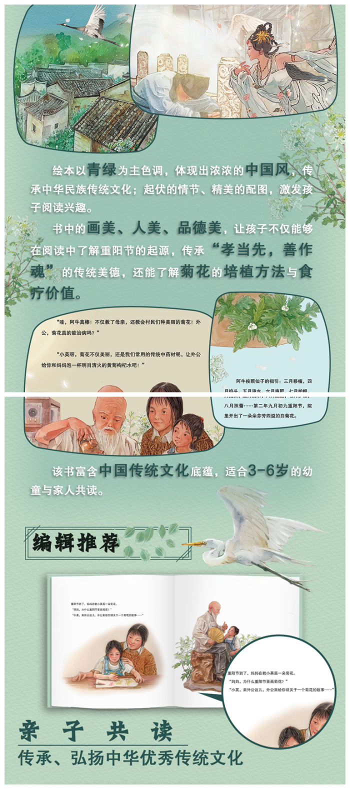 本书是以重阳节民间传说为蓝本进行改编的原创绘本,讲述了孝子阿牛为给母亲医治眼疾,在菊花仙子的指引下翻山越岭寻找白菊的故事。著名旅美插画师胖蛇致力于在传统中寻找灵感,在现代中汲取养分,在创作本书时结合自身经历,倾注了丰沛的情感。绘本以青绿为主色调,体现出浓浓的中国风,传承中华民族传统文化;起伏的情节、精美的配图,激发孩子阅读兴趣。书中的画美、人美、品德美,让孩子不仅能够在阅读中了解重阳节的起源,传承“孝当先,善作魂”传统美德,还能了解菊花的培植方法与食疗价值。该书富含中国传统文化底蕴,适合3-6岁的幼童与家人共读。