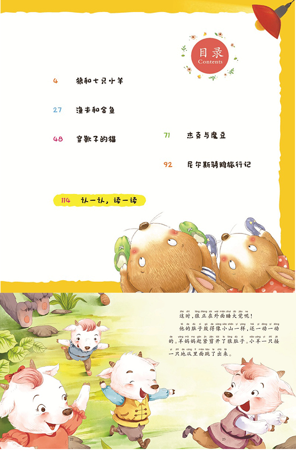 狼和七只小羊在这里上演智斗大戏;有求必应的金鱼也会拒绝无理要求;猫咪穿上靴子,为主人的前程奔走,杰克爬上粗壮的豆茎;尼尔斯骑着白鹅去世界旅行……来,在简单又不失趣味的故事和图画里,为孩子打开一扇通向幻想的大门。
