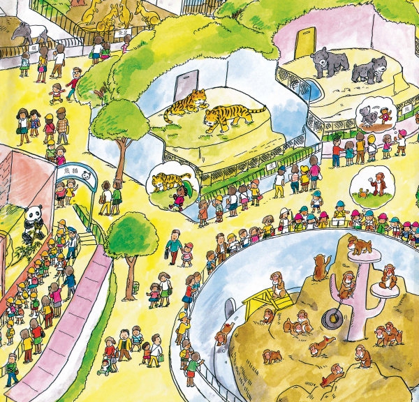 《动物园/长长的画卷》以全景画面展现了从“悠然动物园”的入口到出口的所有景象。这是属于你自己的动物园,无论什么时候都可以去,去多少次都可以。从水鸟到狮子、大象、熊猫……动物园里许许多多的动物都在等待着你的光临。在动物园里的很多地方,孩子们一边观赏动物,一边交谈着,每一处的景象都可以自成一幅画。快来看看这里面有没有你没见过的动物吧!