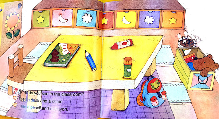 涉及到孩子观察周围的事物:学校,天气,职业,表达,国家等。