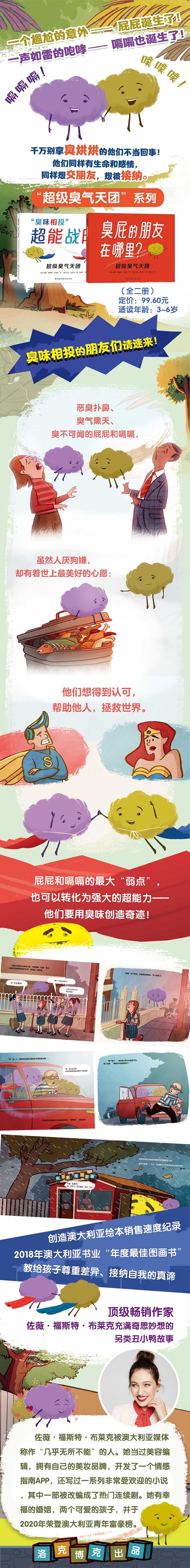 《臭屁的朋友在哪里?》: 咦,什么味道?是屁屁诞生了!这个世界太美好了,屁屁感到无比幸福。要是能交到好朋友,一切就完美了!可是,没有人喜欢屁屁,人们都觉得屁屁又臭,又恶心,又烦人……屁屁能被接纳吗?他能找到“臭味相投”的好朋友吗? 《“臭味相投”超能战队》: 屁屁和嗝嗝是最要好的朋友。他们每天飘来飘去,到处冒险。不过,嗝嗝有个小小的心愿,希望自己和屁屁除了让别人发出“臭死了”的尖叫之外,还能做一些有意义的事……她渴望的机会终于出现了—— 有很多人意外得到了她和屁屁的救援!这对“臭味相投”的朋友能创造更大的奇迹吗? 创造澳大利亚绘本销售速度纪录,被评为2018年澳大利亚书业“年度最佳图画书”。 荣登澳大利亚青年富豪榜的顶级畅销作家薇福斯特·布莱克充满奇思妙想的另类丑小鸭故事。用幽默风趣的态度,陪伴孩子度过“屎屁尿敏感期”。 别人眼中的弱点,也可能是我们...