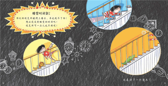 爸爸和妈妈的“诱骗”是一步一步的。比如,在爸爸的鼓励下,伟大的迈克斯拽出了兔子、熊、浣熊(都是在为睡觉做准备),接着,爸爸鼓励迈克斯做“最不可思议的表演”——读10个晚安故事。为了达到这个目的,爸爸又拿出一招:“女士们,先生们,孩子们,我们强烈建议绝对不要在家里尝试这个魔术……”什么?“绝对不要在家里尝试这个魔术”,我偏要尝试尝试!结果,迈克斯又上了圈套啦。