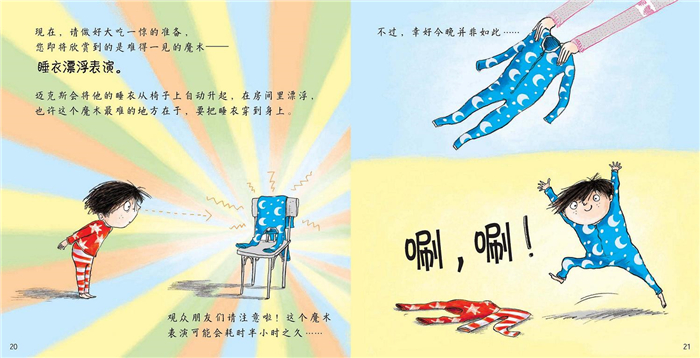 《迈克斯睡前表演秀》真是一本有趣的书。明明是一个幼儿睡觉前的一系列行为,在作者的笔下,生生变成了一场热闹的魔术表演秀。这样的睡前故事简直是闻所未闻。