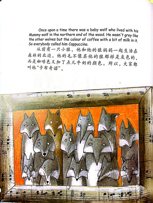 从前有一只小狼,他和他的狼妈妈一起生活在森林的北边。他的毛不像其他狼那样是灰色的,而是咖啡色加了点牛奶的颜色。所以,大家都叫他“卡布奇诺”。