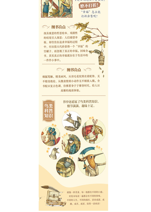 他来了,开着那辆吱呀作响的旧货车。车上的铃铛叮叮当当,很远就能认出他来。叮!叮!是白鸽先生——出售“幸福”的卖货郎。什么?幸福也能买卖吗?没错,白鸽先生的旧货车里,不仅有小罐装的、大罐装的,还有家庭套装的“幸福”出售…… 这是一本深具寓意的哲思绘本,戏剧性的结尾引人深思:人们渴望幸福,却往往在追求幸福的过程中,付出很大代价获得一个“幸福”的空罐子,而忽视了真正的幸福。回味全书,其实真正的幸福就存在于生活中的一件件小事中。
