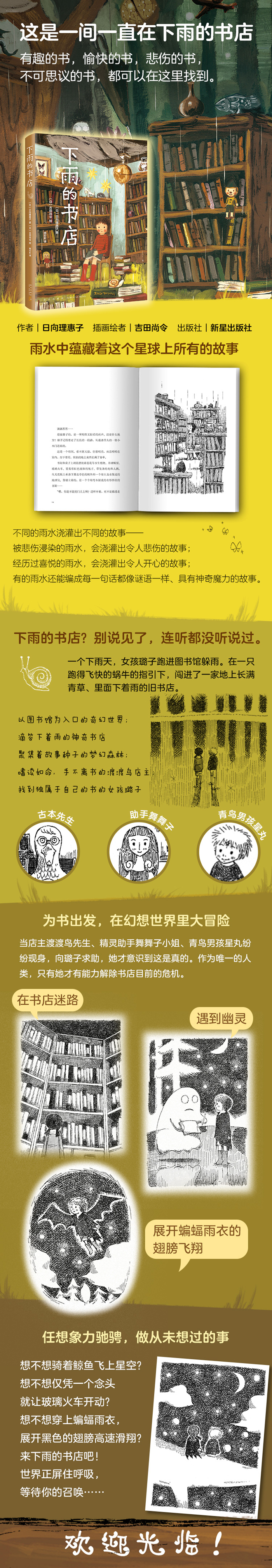 一口气读完《下雨的书店》,不知不觉间获得了想象的力量。多么希望能和善良的璐子、调皮的星丸一起乘着想象力的翅膀,去寻找属于自己的故事。——日本读者