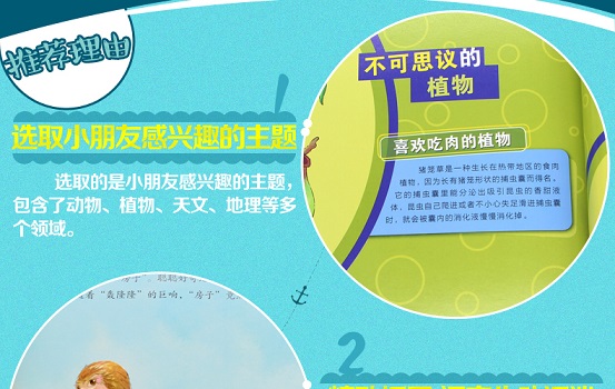 选取的都是孩子感兴趣的主题,包含了动物、植物、天文、地理等多个领域。并将科学和故事相结合,增加孩子的阅读趣味性。