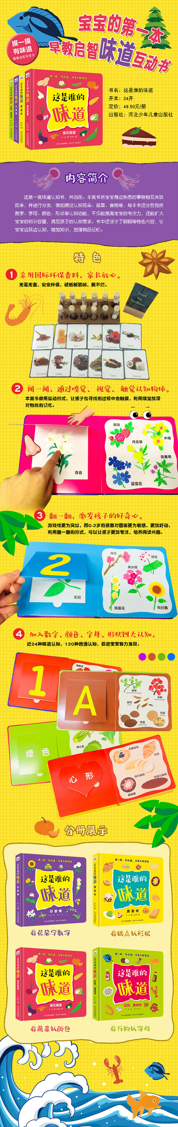 这是一套味道认知书,共四册。本套书将宝宝身边熟悉的事物相互关联起来,并进行分类,借助嗅觉认知花朵、蔬菜、食物等,每本书还分别包括数字、字母、颜色、形状等认知功能,不仅能提高宝宝的专注力,还能扩大宝宝的知识容量,满足孩子的认知需求。书中还设计了翻翻等特色内容,让宝宝边玩边认知,增加知识,加强物品记忆。
