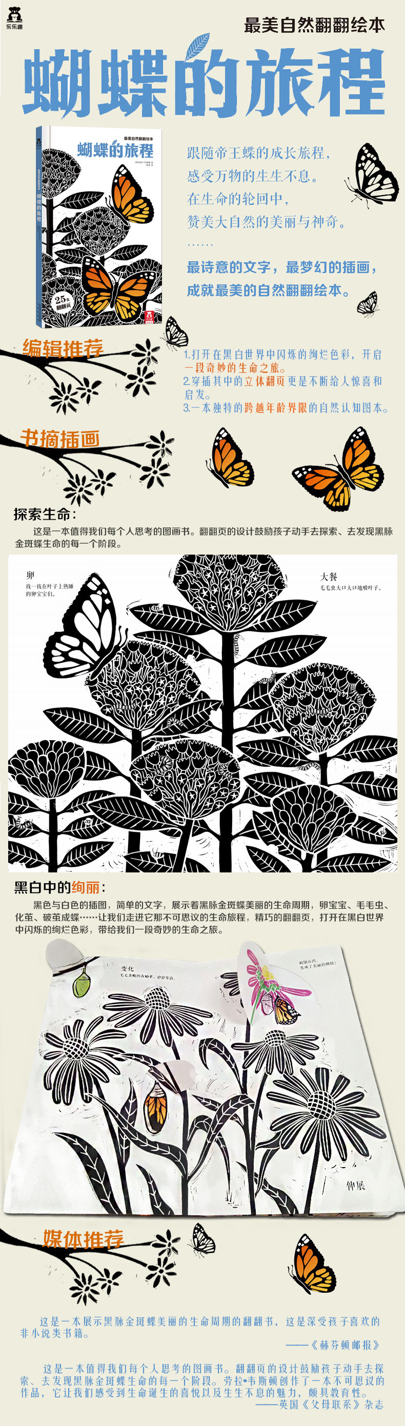 这是一本展示黑脉金斑蝶美丽的生命周期的翻翻书,这是深受孩子喜欢的非小说类书籍。——《赫芬顿邮报》