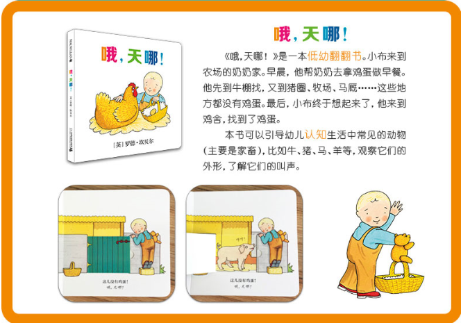 《哦,天哪!》是一本低幼翻翻书,引导幼儿认知生活中常见的动物(主要是家畜),比如牛、猪、马、羊等,观察它们的外形,了解它们的叫声。