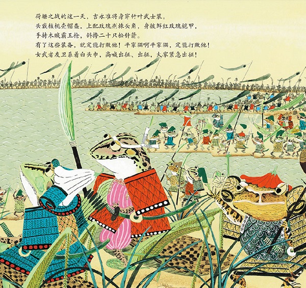 这是一本气势磅礴,充满艺术张力的绘本。书中的故事发生在一个古老的池塘,作者借用传统童谣的讲述方式,以拟人化的笔法描述了青蛙家族与一只大黑猫之前的战争,画面细致生动,非常有感染力。入选厚生省儿童福祉文化奖 入选国际儿童读物联盟(IBBY)荣誉榜。
