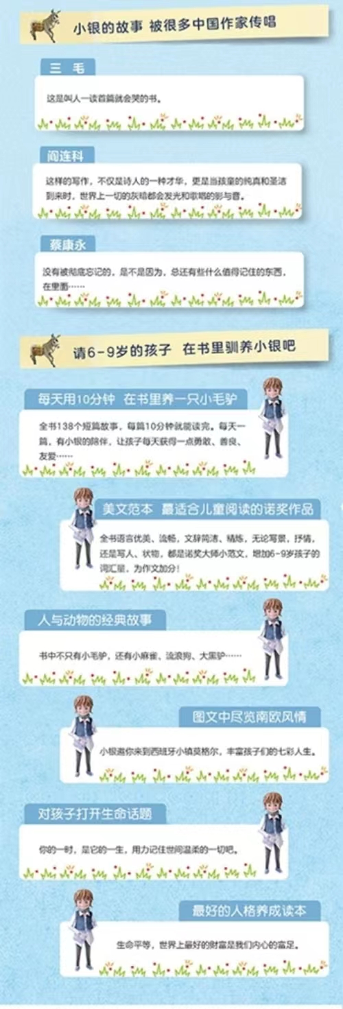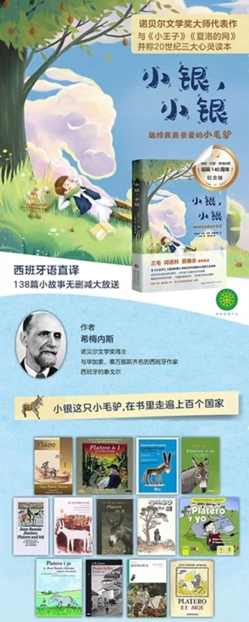 《小银,小银》是诺贝尔文学奖得主希梅内斯的代表作。一个小男孩和一头叫小银的小毛驴的旅行感动了全世界几十个国家的读者。 138篇故事,138个关于爱的温情回忆,在希梅内斯诞辰140周年之际,无删减全新译文中文版面世。 在《小银,小银》的故事中,小男孩带着他的小毛驴小银走过山川小河,看过朝阳与晚霞,听过蟋蟀吟唱的小夜曲,体验过暴风雨带来的恐惧……一朵花、一棵草、一只小鸟、一片落叶,一个扮幽灵的小女孩,一只逃跑的小乌龟,在作者的笔下都有了别样的韵味。 “小银,小银……”一声声真切的呼唤,是作者对小银最深沉的爱与思念,也是他对生命的最高赞美。每一个字、每一句话都寄托着作者对小银长达十年的思念。作者把它对小银的思念打磨成一颗颗珍珠,串成了这本美丽的小书。