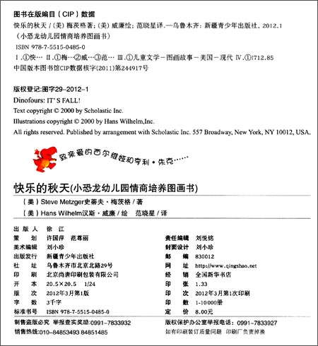 《小恐龙幼儿园情商培养图画书:快乐的秋天》讲述你认识小恐龙幼儿园的小朋友吗?他们是一群活泼、可爱的小恐龙,他们在幼儿园里非常快乐!瞧,小朋友们在五彩缤纷的秋天里享受户外游戏的乐趣……可是,布兰登好端端地却给艾伯特起了一个外号,让艾伯特心里好气恼!快来加入可爱小恐龙的队伍,你会和布兰登一样明白:想要别的小朋友怎样对待自己,自己就先要怎样对待他们。