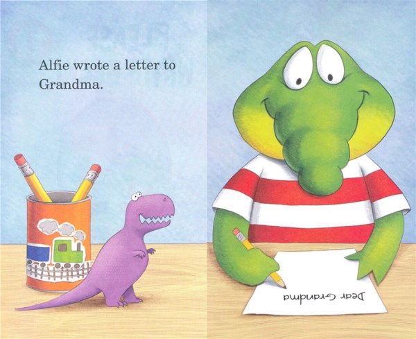 Alfie, an adorable alligator, writes a letter to Grandma all by himself. He addresses the letter, stamps it, and mails it.
