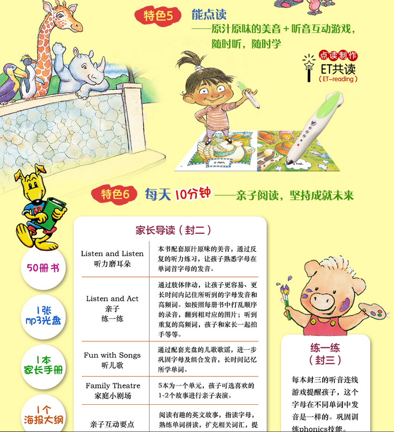 第1级包括: 50本可点读的绘本、1张Mp3光盘、36张拼读卡、1本家长手册和1个大纲挂图。适合初学英语的儿童学习使用。