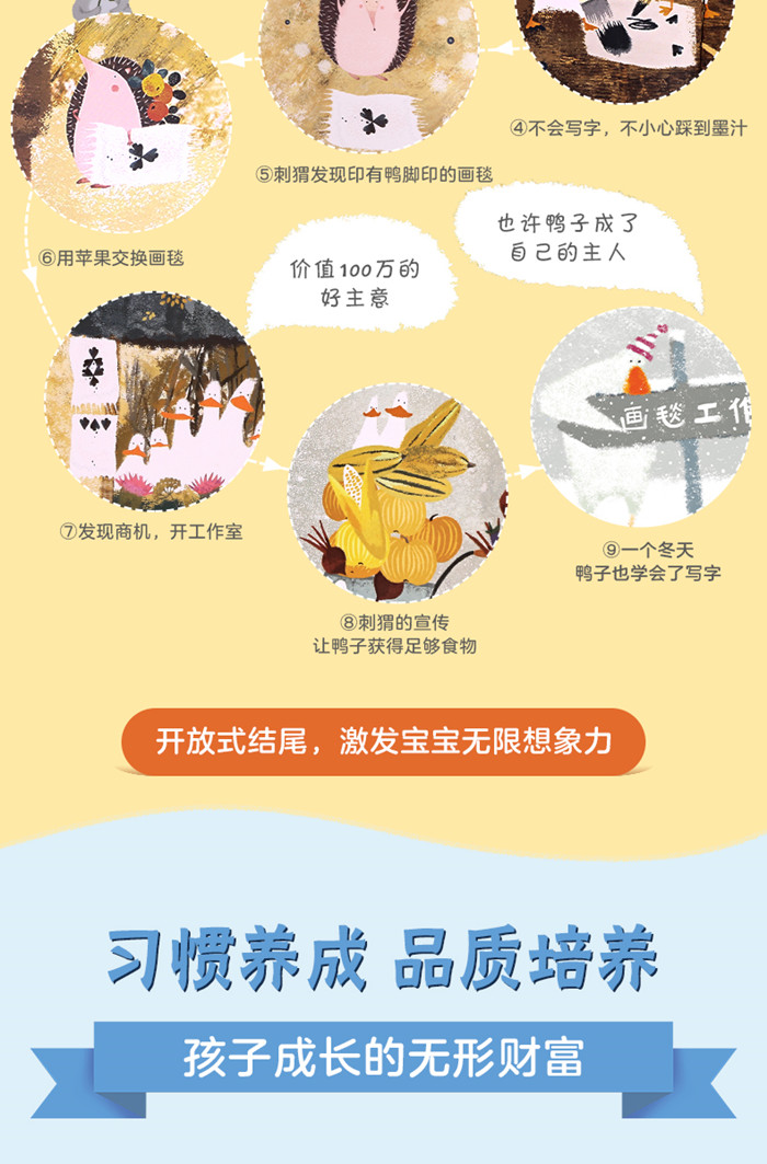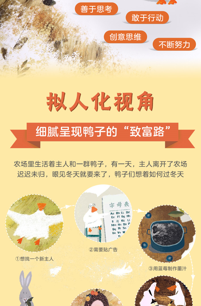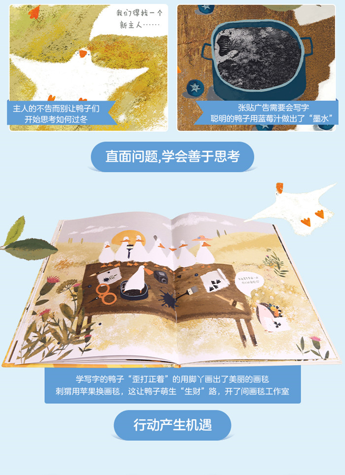 这是一个鸭子寻找新主人的故事,情节很简单。按大家的惯常思维,故事走向可能是鸭子用种种方法*终找到了照料他们的新主人。而这个故事出乎我们的意料,鸭子们在寻找新主人的过程中积极思考自救的方法,乐观的心态和极强行动力使他们意外地发现了自己的才能,开始“创业”,用自己的本事为自己换取所需的物品。