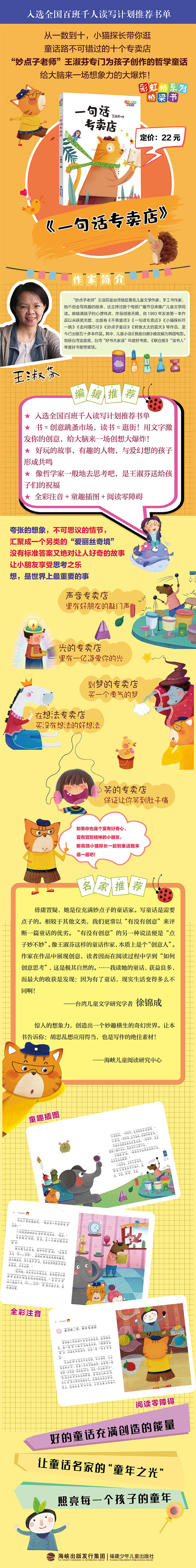 王淑芬的作品创意无限,妙趣横生,不断出新,让你永远“想不到”。书=创意跳蚤市场,读书=逛街?《一句话专卖店》中,小猫探长带大小读者进入书中,认识有趣的人,拜访充满奇想的地方。这本书里,既热闹又不可思议的店名,大大满足了小猫探长的好奇心。店里出现的奇妙商品、神秘店长、古怪顾客,更为故事带来想象大爆炸的能量。 本书意在让读者从故事中体验人生各种情境,进而思索其意义,让大小读者在故事花园里,迷路也好、找到出口也好,在花园的繁花盛景中,享受思考的乐趣与收获。