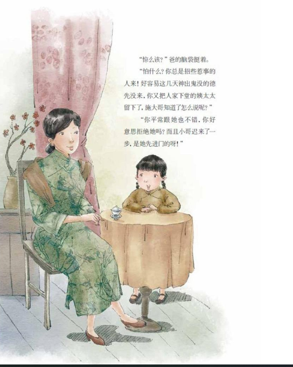 宋妈的鸡毛掸子轮到来掸我的小床了,小床上的棱棱角角她都掸到了,掸子把儿碰在床栏上,格格地响,我想骂她,但她倒先说话了:“还没睡够哪!”说着,她把我的被大掀开来,我穿着绒褂裤的身体整个露在被外,立刻就打了两个喷嚏。她强迫我起来,给我穿衣服。印花斜纹布的棉袄棉裤,都是新做的,棉裤筒多可笑,可以直立放在那里,就知道那棉花够多厚了。