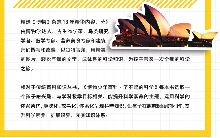 博物少年百科系列共6本,主题分别为:恐龙、鸟类、人体知识、身边的科学、零食奥秘和神奇建筑,分别由古生物学家、鸟类研究者、医学专家、博物学达人、营养师和北京四中教师改编推荐,以独特视角,用精美的图片、轻松严谨的文字,成体系的科学知识,为孩子带来一次全新的科学之旅。