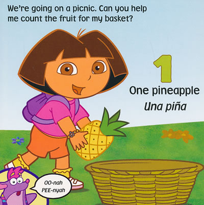 It’s time for a picnic, and Dora and Boots want to fill theirbasket with yummy fruit to eat. In this engaging, bilingual boardbook, young readers will love learning to count coconuts, bananas,pineapples, and more with the help of their favorite explorer. Thisedition of a favorite sturdy board book includes English andSpanish vocabulary for numbers one to ten and for a variety offruits, with pronunciation help on each page, and features anenlarged size and a refreshed cover.