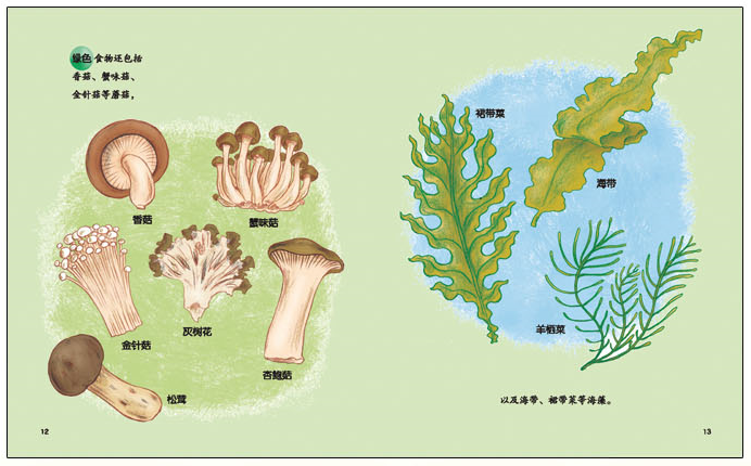 这些蔬菜都属于绿色食物。除了红色、黄色、橙色和紫色的蔬菜,水果、蘑菇和海藻等也属于绿色食物。