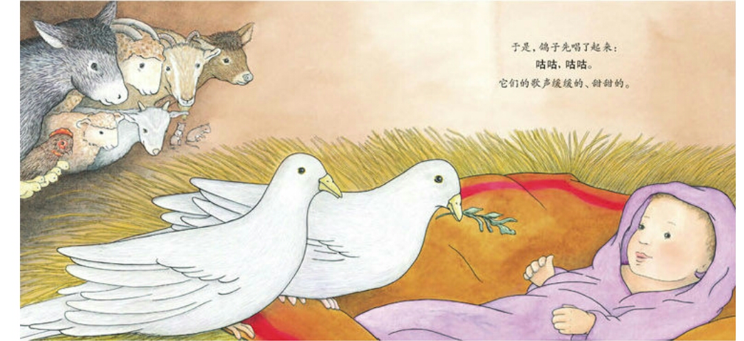 很久很久以前,在一颗亮闪闪的星星下……一个特别的小宝宝在马厩里出生了,小动物们,包括鸽子、小鸡、老鼠、山羊等都轮流唱歌给小宝宝听,欢迎他的到来。害羞的小毛驴也很想给他唱一首欢迎歌,可又怕自己的大嗓门太吵。*后,在小宝宝甜美笑容的鼓励下,小毛驴终于展开歌喉,用自己独特的歌声逗得小宝宝开心大笑。