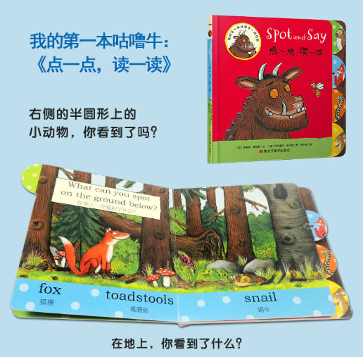 《我的一本咕噜牛·游戏书》是孩子们最喜爱的游戏书系列,包含触摸书、视觉大发现、翻翻页等各种好玩的小机关,孩子可以自己动手动脑动眼,去发现这个世界的精彩!打开大胆又惹眼的书,每一页都可以触摸哦:摸一摸咕噜牛可怕的尖牙,摸一摸他疙疙瘩瘩的膝盖、挠一挠他的紫色刺针。你能找到咕噜牛和朋友们吗?跨一步,走进黑黑的森林深处,睁大眼睛哦!是谁躲在树后面?翻一翻,找到《咕噜牛》里的你喜爱的所有角色。