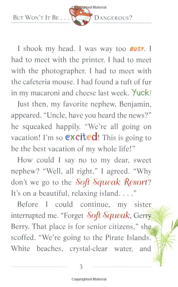 Holey Cheese! Imported from Italy, this snazzy series debut about a globetrotting mouse journalist spreads the cheesy puns nice and thick. On an average day, Geronimo Stilton edits The Rodent's Gazette, the newspaper of New Mouse City, capital of Mouse Island. But at the coaxing of his sister, Thea, and various relatives, Stilton sates his yen for adventure-and adventure writing-by embarking on various excursions and recording and illustrating his exploits in a diary that serves as source material for his books. Stilton, Thea, cousin Trap and nephew Benjamin board a ship in search of buried treasure on a secret deserted island. The trip is filled with peril and plenty of humor, though the treasure isn't what anyone expected. The book's lightning pace and its numerous chapters, as well as a full-color design that displays key words in color type and fun fonts, will hook kids in a flash. And those with a taste for Stilton's breezy style will surely want to devour future "whisker-licking-good stories," as the author calls them. The first four book in the Geronimo Stilton series will be released simultaneously, followed by one book per month thereafter