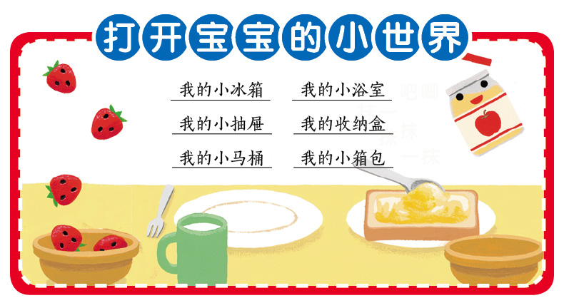 初生的宝宝如同初升的太阳。宝宝凝望着这个世界,每天都有新奇的发现。在宝宝内心,也有一个世界,充满灵性和光热,每天都有精彩的展现。大人们急着要把外面的世界呈现给他们,因此很多对教育的议论都是从“大处高处”着眼的,但是《打开宝宝的小世界》正好相反,作者和编者蹲下身子、以与宝宝平起平坐的姿态,从“小处低处”出发,走进0-3岁宝宝心中隐秘的“小小世界”。打开《我的小冰箱》,牛奶、苹果酱、小草莓、小鸡蛋,帮助宝宝认知营养早餐,让宝宝养成良好饮食习惯。推开《我的小浴室》,小香皂“咕唧咕唧”,洗发露“唰唰嚓嚓”,小喷头“哗啦哗啦”,小玩具“扑通扑通”,让宝宝在游戏中养成良好的卫生习惯。拉开《我的小抽屉》,小短裤、小T恤、小袜子,一件一件穿好。出门用的小手帕、小小熊,一样一样准备好。看,自己的事情自己做,连出门准备都不用爸爸妈妈操心了。坐上《我的小马桶》,我能自己拉臭臭了,妈妈能放心送我去幼儿园了。拉开《我的小箱包》,爸爸的、我的、妈妈购物的包包,我有明确的自我意识了。打开《我的收纳盒》,玩具箱、手工盒、蛋糕盒、便当盒,每样物品都分门别类,我有分类收纳的好习惯。