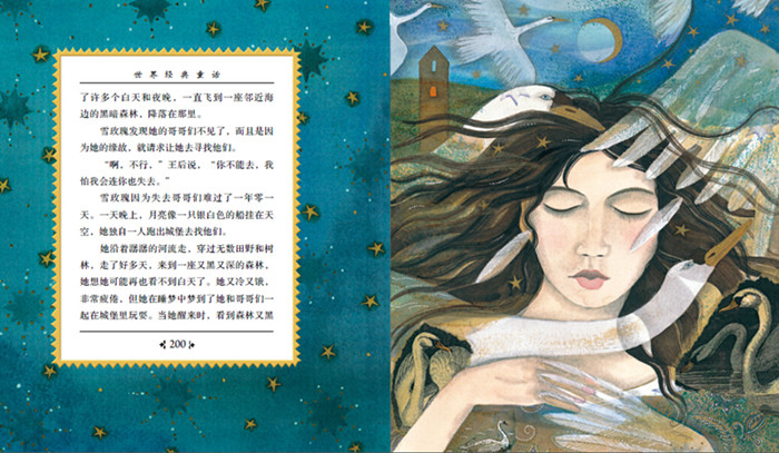 简·蕾的绘画设计,给予不同的故事以多姿多彩的外衣。既有传统艺术图案,也添加了独具风格的插画拼贴材料,使整个故事具有多民族的特点,从亚洲到印度到欧洲,无一不包含其中,是非常适合收藏的精美童书!