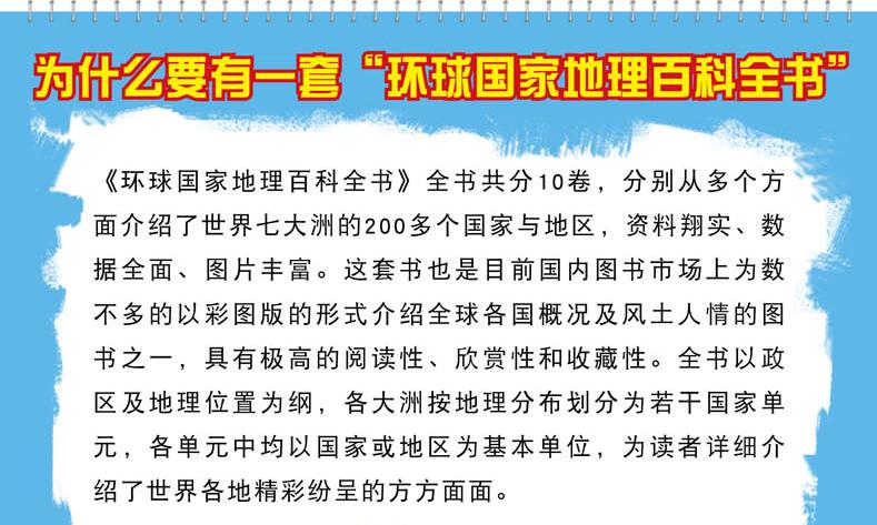 3.全书共分10卷,分别从多方面介绍了世界七大洲的200多个国家与地区,资料翔实、数据全面、图片丰富。