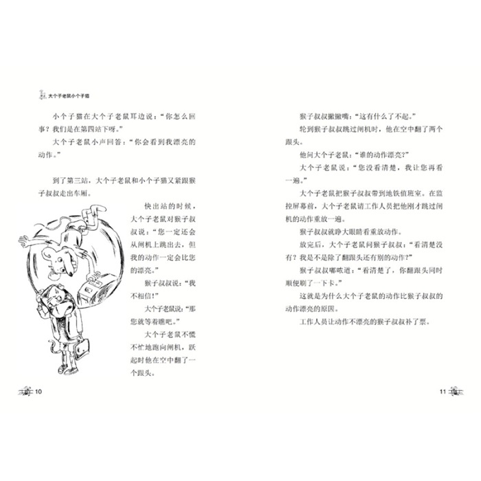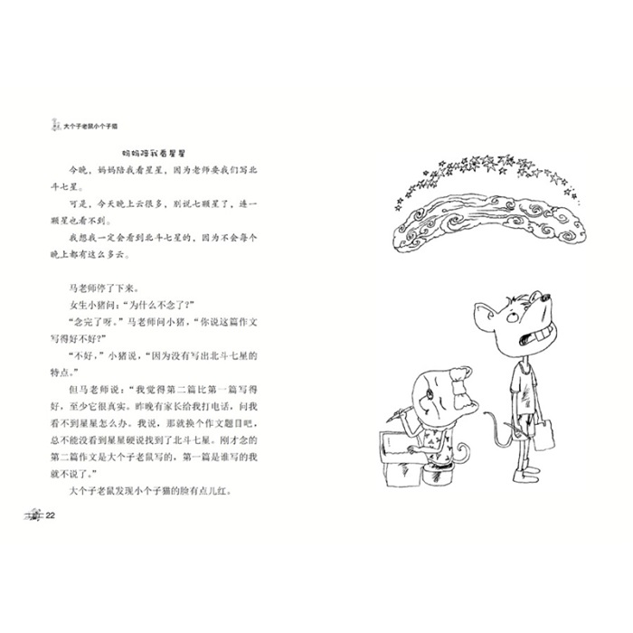 大个子老鼠是男生, 小个子猫是女生, 他们是好朋友。 大个子老鼠真诚、友爱, 小个子猫聪明、漂亮, 他们在一起互相关怀,才使共同经历的每件事情看上去都那么美好。