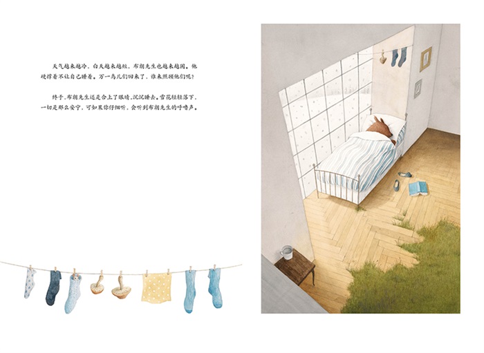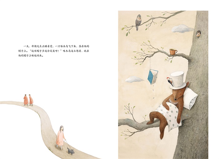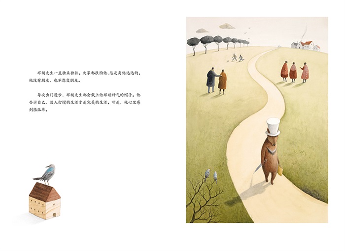 《柯克斯评论》《学校图书馆》一致推荐。 布朗先生相信没人打扰的生活才是理想的生活,啄木鸟的突然闯入打破了这一切。布朗先生开始有些不适应,但渐渐感受到了陪伴的温暖。布朗先生和鸟儿们的相处表达了人们对朋友的深切渴望,友谊的润泽让布朗先生原本寂寞的生活变得丰富多彩,也让他的心更加柔软。同时,啄木鸟也象征着生活中那些突如其来的变化,鼓励孩子积极面对,勇于接受不一样的生活经历。 作者今井彩乃六次入选博洛尼亚插画展,创作了《穿靴子的猫》《切斯特找新家》等作品。她以细腻的笔触、简约的色彩和诗意的文字叙事著称。本书中,今井彩乃描绘的朴素小镇、纤细羽毛以及柔和光影,都为故事打造出了温暖宁静的氛围。窄长形的开本设计和留白版式也恰到好处。 细腻的超现实主义插图,赋予了这个故事奇幻的本质。布朗先生的古怪,以及城镇的朴素,都为故事增添了令人动容的奇幻感。聪明的小读者将欣赏到充满细节、梦幻和富有想象力的艺术作品。这本书的开本就像布朗先生的帽子一样高高窄窄的,需要放在书架上的一个特殊的位置。但它不会一直摆在那。——《学校图书馆》 今井彩乃的插图描绘了平凡的日常和奇幻的景象,例如啄木鸟在帽子上筑巢以及帽子长成了一棵大树。这本书的设计也无可挑剔,呼应了故事中的细节,比如竖开本的设计(呼应了小鸟住的高帽子),环衬和图文的排版也富有巧思。文字仅在左页,并附有小幅插图,而全页插图则在右页。每个跨页对留白的应用,增添了故事宁静和梦幻的氛围。——《柯克斯评论》