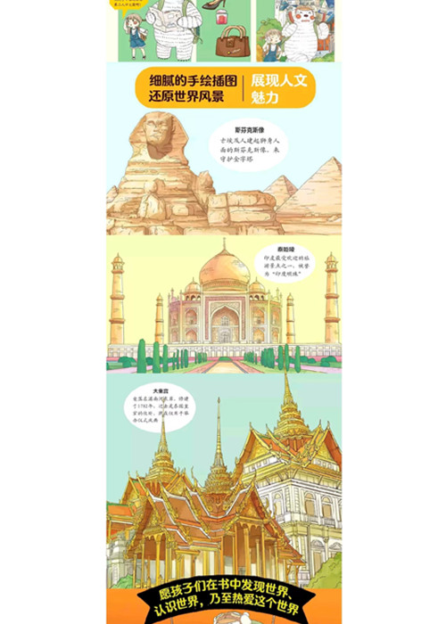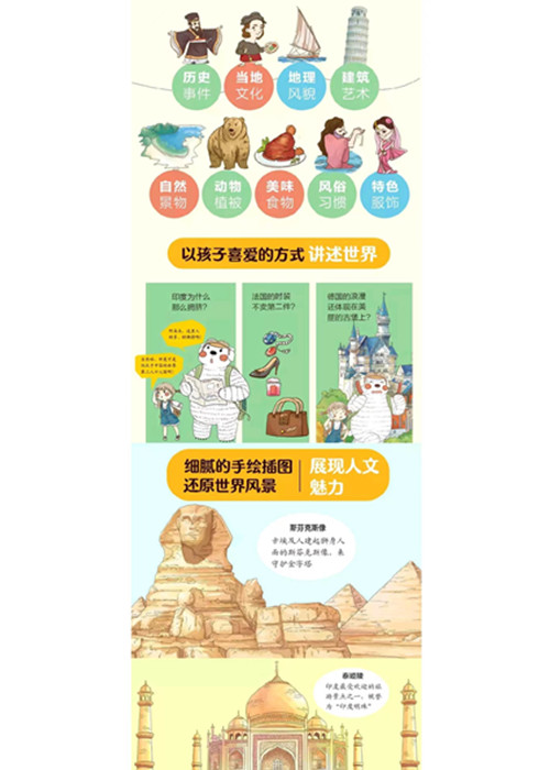 这是一本画给孩子的世界人文地理绘本,也是一本儿童国家地理百科,更是一本以北极熊灿烂和小女孩阿朵朵为主角的旅行游记。两位主人公去到英国、法国、希腊、埃及等18个国家,不仅体验当地的风土人情,还为大家介绍该国家的特色文化、历史地理、建筑艺术、服饰美食等各方面的知识。同时,书中的手绘图画还原了各个国家的风格,翻开即置身那奇妙的国度,让孩子以他们喜爱的方式发现世界、认识世界,乃至热爱这个世界。