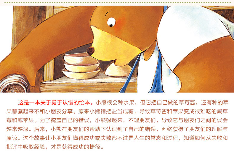 承认错误,学会担当——《咸苹果的滋味》小熊很会种水果,但它把自己做的草莓酱、种的苹果都藏起来不和小动物们一起分享,你知道这是为什么吗?原来它错把盐当成糖了。为了掩盖自己的错误,它与小动物们之间起了误会,越走越远,后来小熊与它们怎么样了呢?