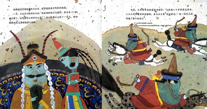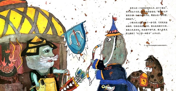 民间故事的魅力在于你听得越多越有兴味。经过你说他说,故事呈现出丰富的面貌与灵魂。这两个民间故事,一个来自中国,一个来自日本,两个国家故事被画家用中国画洒金、丙烯颜料以及河南泥人的造型演绎得活泼生动、鲜明有趣,音容笑貌跃然纸上。