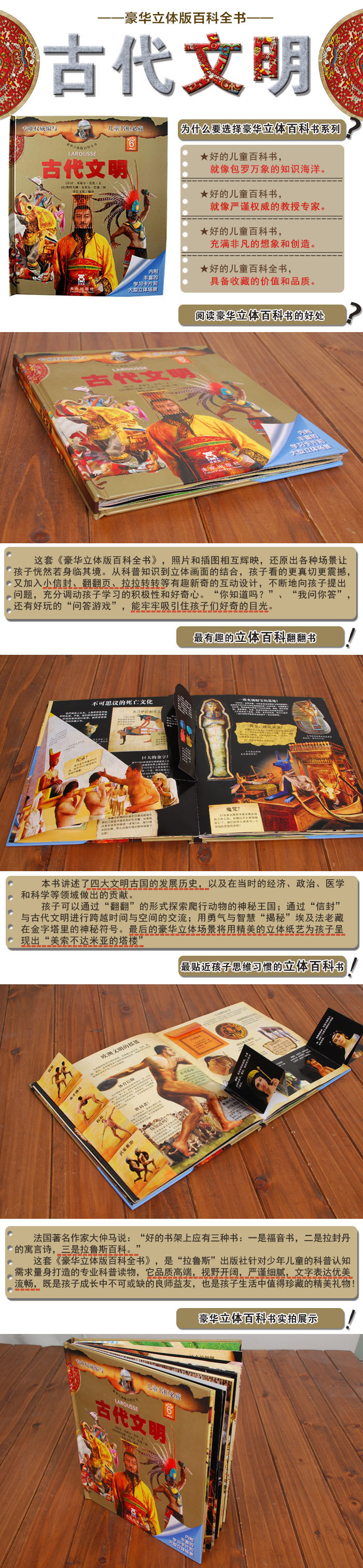 本书讲述了四大文明古国的发展历史,以及在当时的经济、政治、医学和科学等领域做出的贡献。文字内容丰富,形象生动,知识含量很高,内文中翻翻和信封等多种阅读方式激励孩子去探索知识,寻找答案,书的最后一页还有一个非常华丽的立体场景,它给孩子在得到知识的同时,也带来了见识和惊喜。
