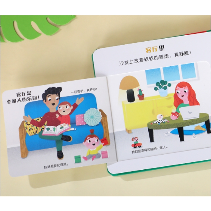 这本书介绍了家里的厨房、客厅、浴室、卧室及其里面的家具陈列等,帮助宝宝熟悉家中环境,认知家中事物。每跨页左页为一个大大的翻翻页,翻页上有提问,打开翻页,不仅有问题的答案,还有一幅大大的场景图,让宝宝自己去观察与发现;右页延伸左页主题,用小翻翻页配合转盘玩具讲述相关小知识。这样的设计可以培养宝宝的联想记忆能力,发散宝宝思维。翻一翻,转一转,宝宝通过玩互动机关锻炼手指,动手又动脑。