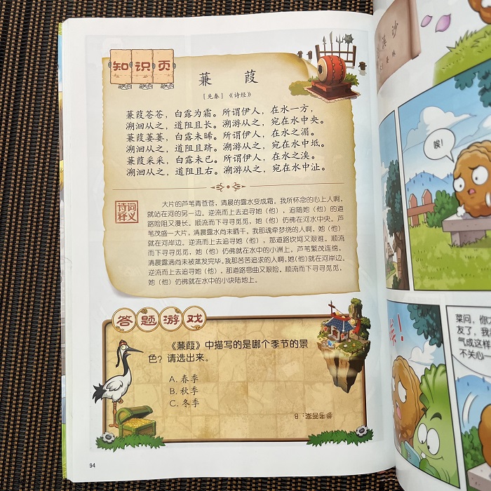 古诗词是中国古典文学宝库中瑰丽的传奇,是中华五千年文明的凝练,散发着永恒的魅力。学习它,可以陶情怡性、开阔视野、增长学识。本系列图书以“植物大战僵尸2”中的形象为主角,选取小学生必读必知的经典诗词内容,采用“幽默漫画+诗词解析+趣味问答”的方式,为小读者打开古诗词诵读之门,是一套有趣的古诗词启蒙书,是一场“少儿漫画版中国诗词大会”。书中,古典诗词被巧妙地融入漫画展开内容故事,可以让小读者开开心心读漫画,轻轻松松学诗词。本系列图书集趣味性、文学性和思想性为一体,用千载诗词启迪孩子的成长,用古典文化滋养孩子的心灵,让孩子接受并传承中国优秀的传统文化,弘扬民族自豪感和自信心。《植物大战僵尸2·中国古诗词大会漫画2》为本系列第四册,内容包括32首经典的古诗词。