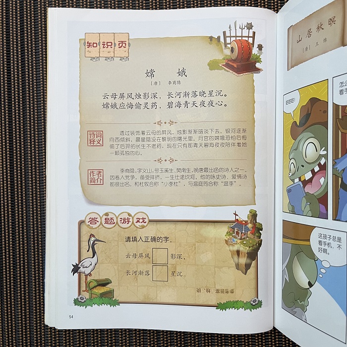 古诗词是中华五千年文明的凝练,是中国古典文学宝库中瑰丽的传奇,散发着永恒的魅力。学习它,可以陶情怡性、开阔视野、增长学识。本系列图书以“植物大战僵尸2”中的形象为主角,选取小学生必读必知的经典诗词内容,采用“幽默漫画+诗词解析+趣味问答”的方式,为小读者打开古诗词诵读之门,是一套有趣的古诗词启蒙书,是一场“少儿漫画版中国诗词大会”。书中,古典诗词被巧妙地融入漫画展开内容故事,可以让小读者开开心心读漫画,轻轻松松学诗词。本系列图书集趣味性、文学性和思想性为一体,用千载诗词启迪孩子的成长,用古典文化滋养孩子的心灵,让孩子接受并传承中国优秀的传统文化,弘扬民族自豪感和自信心。《植物大战僵尸2·中国古诗词大会漫画2》为本系列第五册,内容包括32首经典的古诗词。