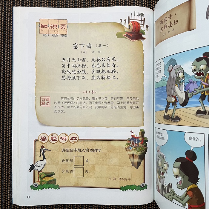 本系列图书是一套有趣的古诗词启蒙书,以“植物大战僵尸2”中的形象为主角,选取小学生必读必知的经典诗词内容,采用“幽默漫画+诗词解析+趣味问答”的方式,为小读者打开古诗词诵读之门,是一场“少儿漫画版中国诗词大会”。书中,古典诗词被巧妙地融入漫画展开内容故事,可以让小读者开开心心读漫画,轻轻松松学诗词。本系列图书集趣味性、文学性和思想性为一体,用千载诗词启迪孩子的成长,用古典文化滋养孩子的心灵,让孩子接受并传承中国优秀的传统文化,弘扬民族自豪感和自信心。《植物大战僵尸2·中国古诗词大会漫画6》为本系列第六册,同样包括32首经典的古诗词。