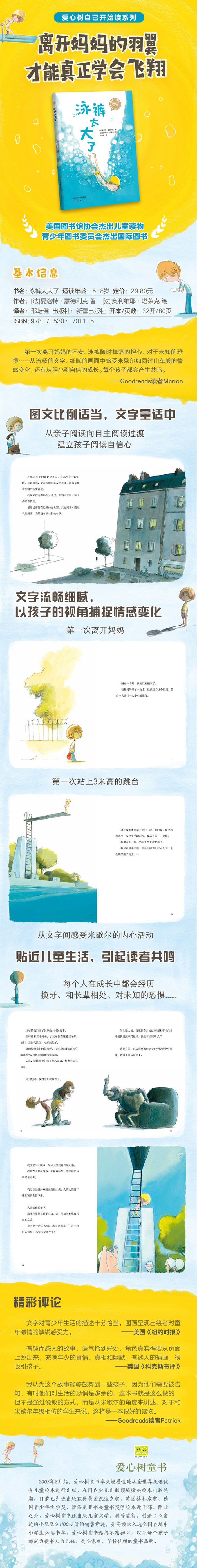 米歇尔是班上个子ZUI小的孩子,到现在还没换过一颗牙,而且很喜欢黏着妈妈。这个夏天,他要独自去乡下姥姥家度假。除了di一次离开妈妈的不安,米歇尔还要面对爱捉弄人的表哥们、不苟言笑的姥爷,以及可怕的跳水考验——这是他们家的传统,每个孩子八岁时都要从三米高的跳台跳进泳池。更糟糕的是,换泳裤时米歇尔才发现自己带来的竟然是哥哥的大泳裤,穿上随时都可能掉下来!他该怎样面对接下来的跳水挑战?