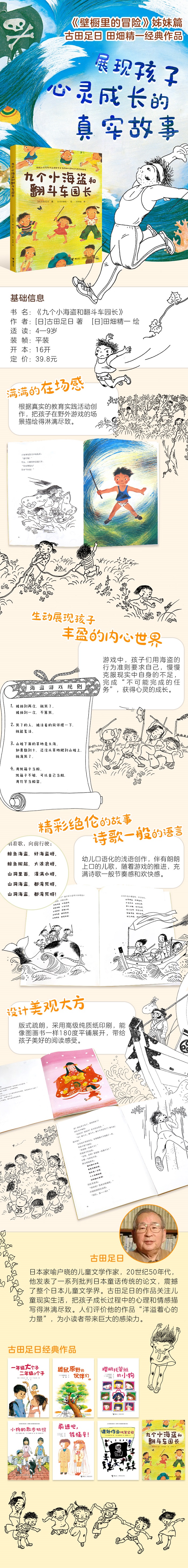娃娃幼儿园很小,没有运动场,也没有秋千和滑梯。大个子园长却说整座城市都是他们的运动场,他们有扶手“滑梯”、树藤“秋千”,还有一座日向山。在山上,孩子们扮海盗,和园长展开了激烈的“战斗”。九个小“海盗”通力合作,凭着智慧和勇气赢得胜利,而后打败园长的“英雄”,却是胆子小的女孩小樱。 本书根据真实的教育实践活动创作,作家和画家用温暖、细腻的笔触再现孩子在野外游戏的场景。孩子们自己制订游戏规则和作战计划,在现实和想象中自由穿梭,在合作中完成“不可能完成的任务”,获得心灵的成长。在作家和画家的细细描摹下,孩童丰盈的内心世界纤毫毕见,让人感动。园长平等对待孩子、鼓励孩子无拘无束进行探索的教育方式也带给人们思考。