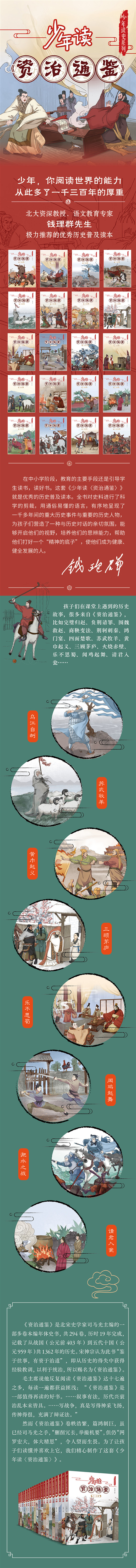 全套20本书,311个故事,体量是同类书的两倍、三倍,甚至十倍,可能呈现一千多年历史上的重大事件和重要人物。比如,历史上著名的“明修栈道,暗渡陈仓”的故事,在《资治通鉴》中只有100多个字,《少年读 资治通鉴 》第3册第6篇《还定三秦》则用3000字的篇幅把刘邦为了东进中原,采用韩信“声东击西”的策略,明着修理栈道,实则奇袭陈仓、夺取关中的故事演绎得有声有色,细节十分丰富。 故事剪裁科学,既不拖沓冗余,也不跳跃太大,注重历史事件的连续性和系统性,讲究由小故事串起大事件,用大事件演绎大时代。故事与故事之间,相互承传、次序分明,有条不紊地把历史推向纵深,帮助少年读者更真实、立体地感知历史发展的脉络,避免整个历史读起来碎片化。