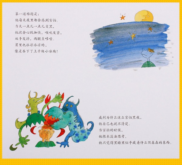 主人公威利有两个难题:一是怕黑,二是不敢告诉爸爸妈妈怕黑。为了掩藏自己的恐惧,威利做了很多让爸爸妈妈不解的事情。后来,在爸爸妈妈和外婆的帮助下,威利终于找到了应对恐惧的方法。