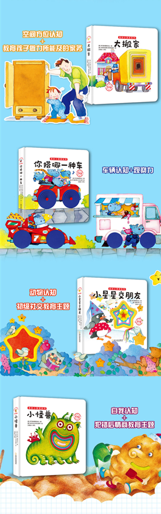《奇妙小洞洞系列》目前包括7个分册,分别是 《小怪兽》《兔子妈妈有块布》《小星星交朋友》《彩虹村》《你搭哪一种车》《大搬家》《这是谁的》。